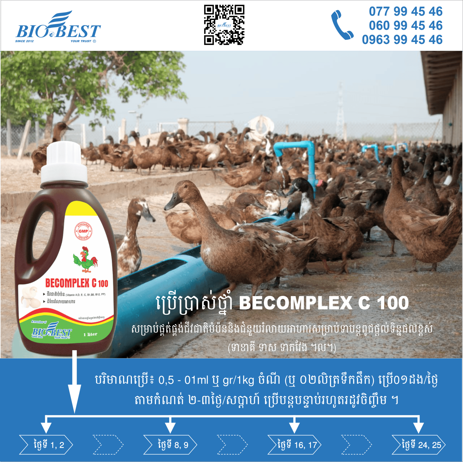 • ឱ្យស៊ីតាមកំណត់៖ 0,5 - 01ml ឬ gr/1kg ចំណី (ឬ ០២លិត្រទឹកផឹក) ប្រើ0១ដង/ថ្ងៃ តាមកំណត់ ២-៣ថ្ងៃ/សប្តាហ៍ ប្រើបន្តបន្ទាប់រហូតរដូវចិញ្ចឹម ។